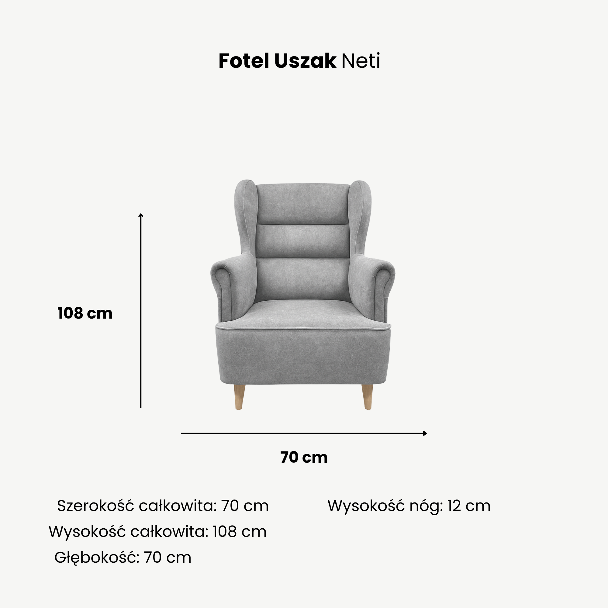 Fotel Uszak Neti to połączenie klasycznej formy z nowoczesną lekkością, tworzące mebel idealny do codziennego relaksu. Jego charakterystyczne, wysokie oparcie z delikatnie wyprofilowanymi bokami zapewnia wygodne podparcie i poczucie otulenia, typowe dla foteli typu „uszak”. Neti wprowadza do wnętrza przyjemną atmosferę, podkreślając ciepły, domowy charakter pomieszczenia.