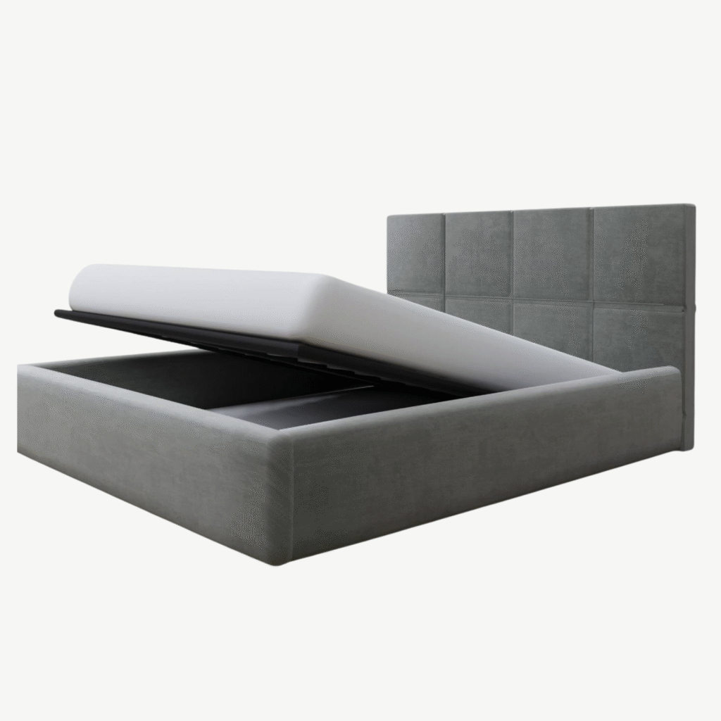 Wysokie wezgłowie panelowe wygodnie podpiera plecy, a podnoszony pojemnik mieści pościel i koce. Siłowniki ułatwiają podnoszenie, więc dostęp do schowka jest szybki i bezpieczny.