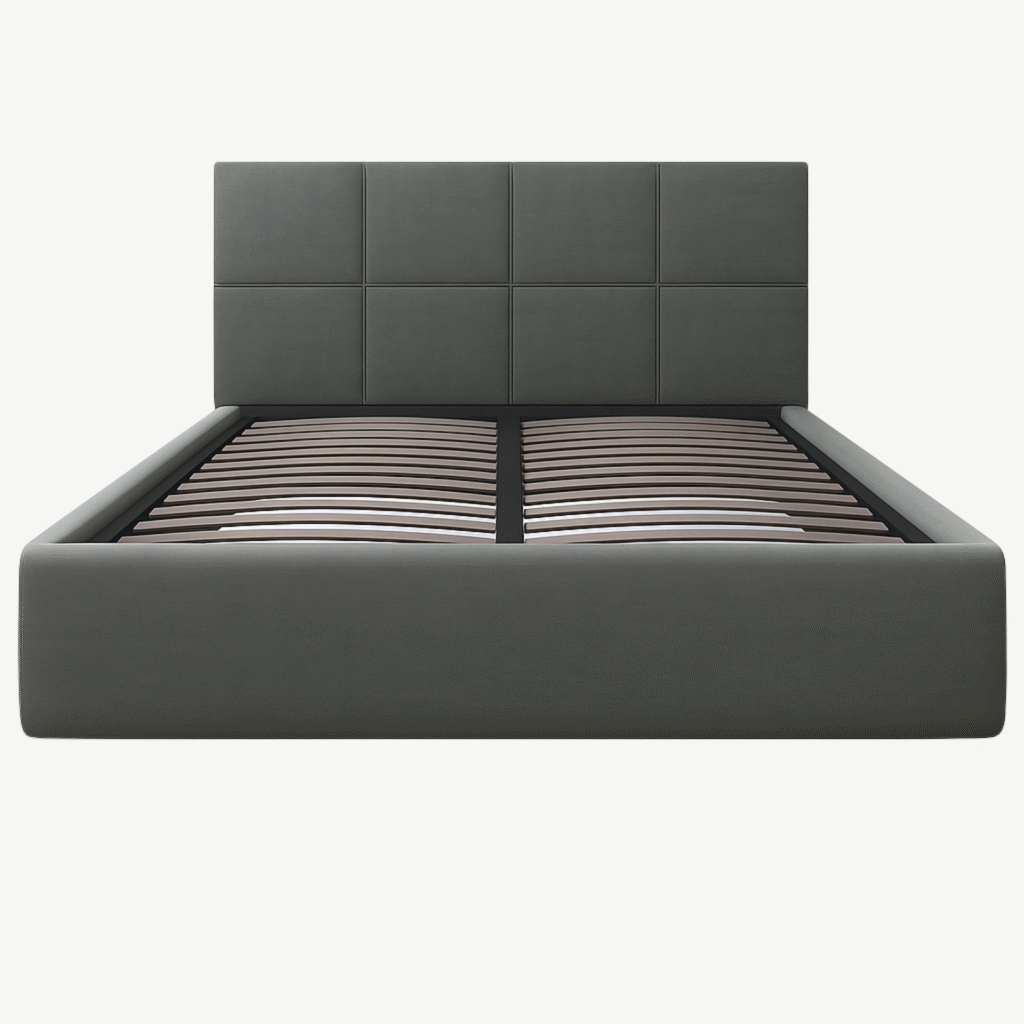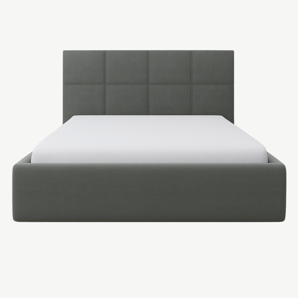Eva łączy wyraziste, geometryczne wezgłowie z prostą, gładką ramą. Panele w formie równych kwadratów porządkują kompozycję i stanowią wygodne oparcie do czytania. Stabilny stelaż metal + listwy drewniane gwarantuje równomierne podparcie materaca oraz dobrą wentylację, a pełnowymiarowy pojemnik pod całym łóżkiem pozwala schować pościel, koce i sezonowe tekstylia. Staranna tapicerka, równe szwy i czysta forma sprawiają, że model bez trudu wpisze się w aranżacje nowoczesne i klasyczne.