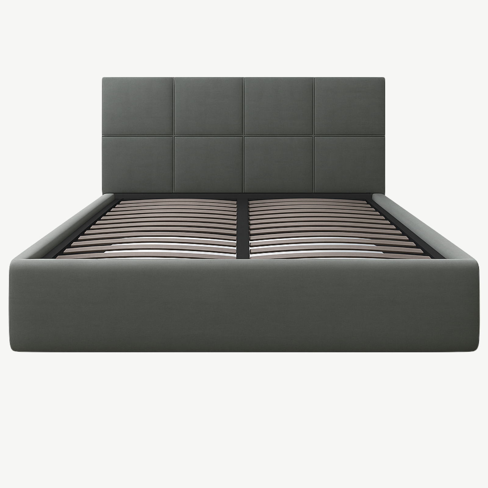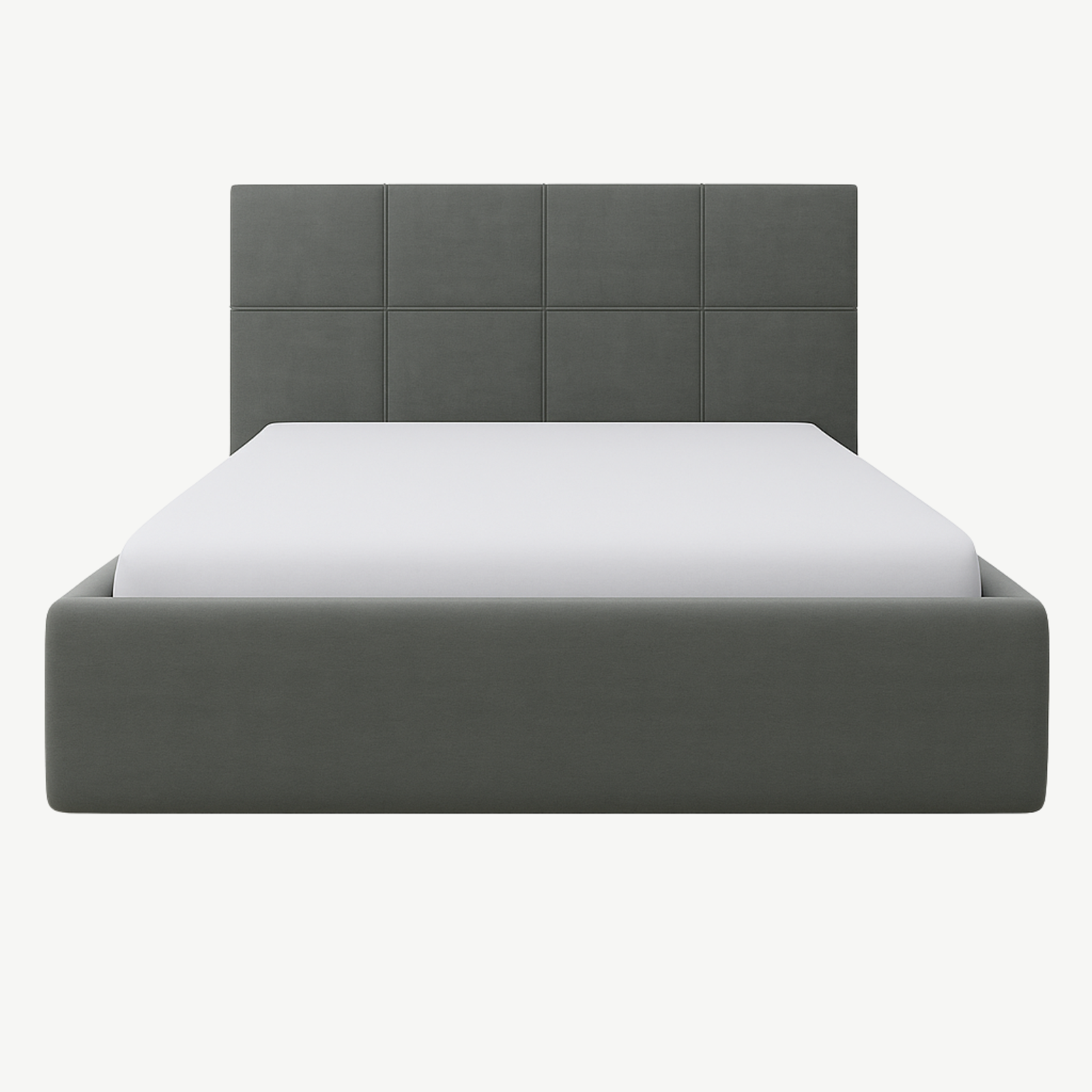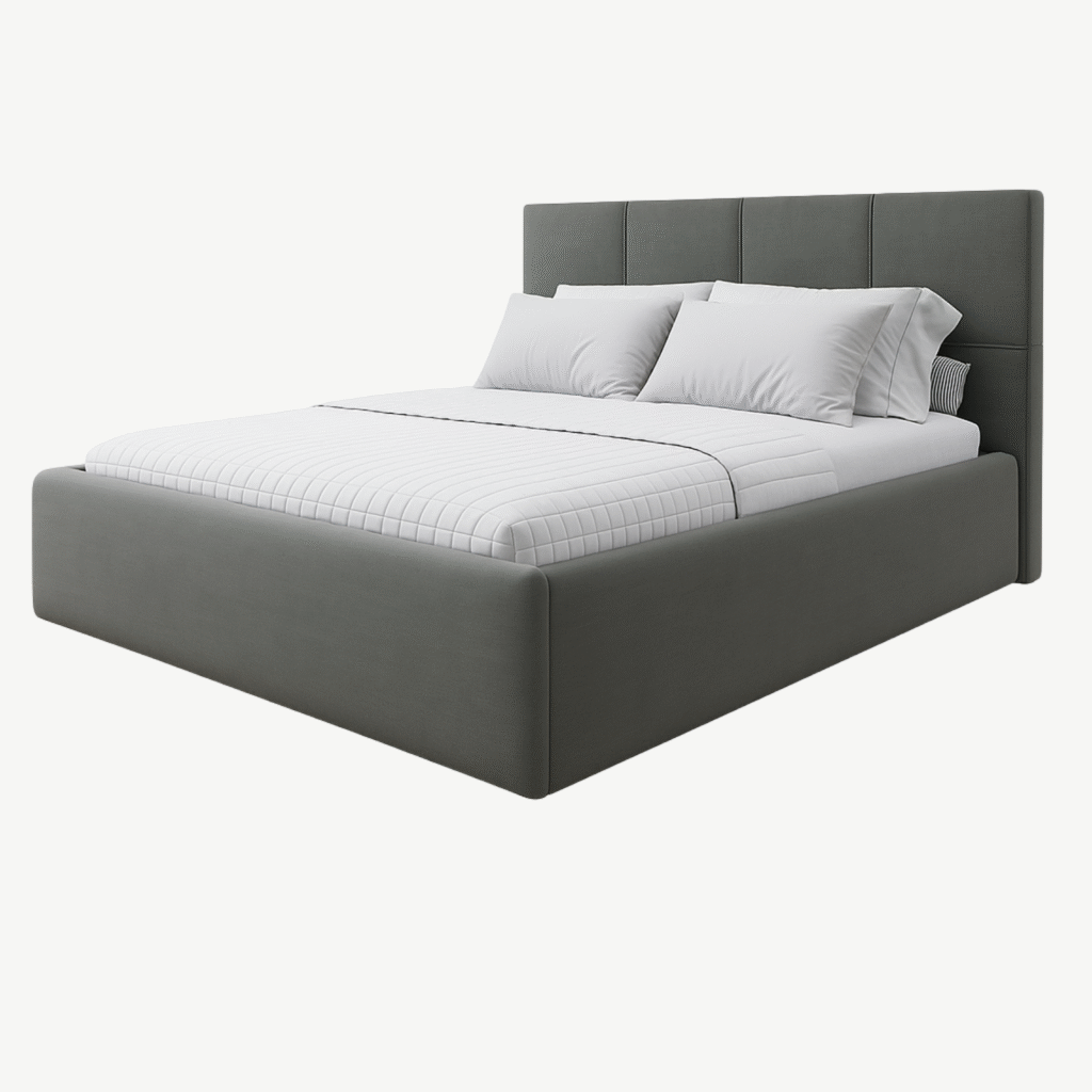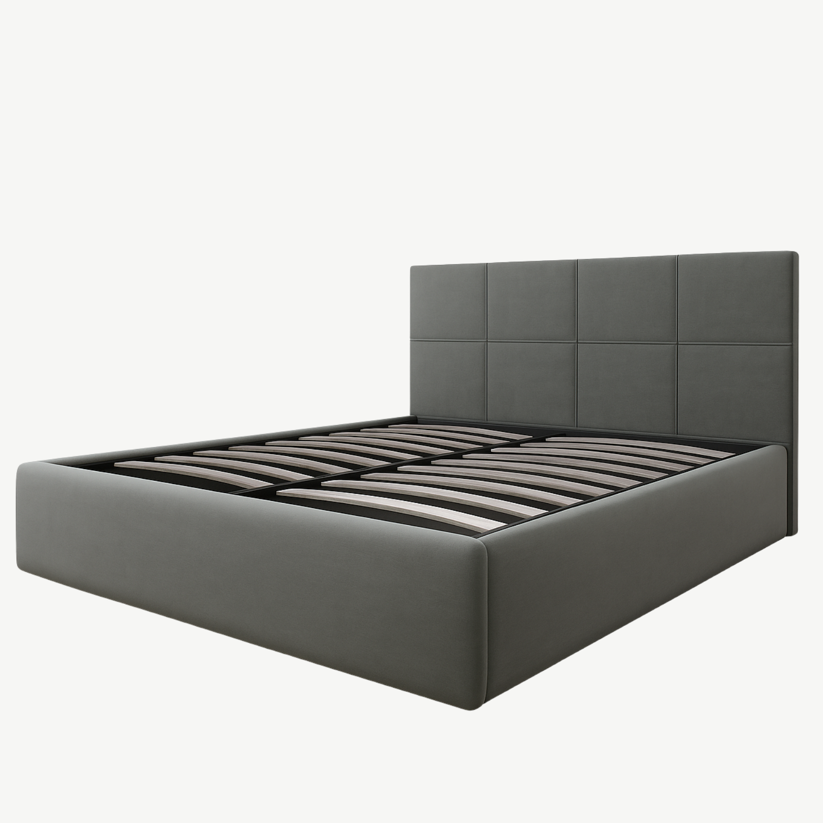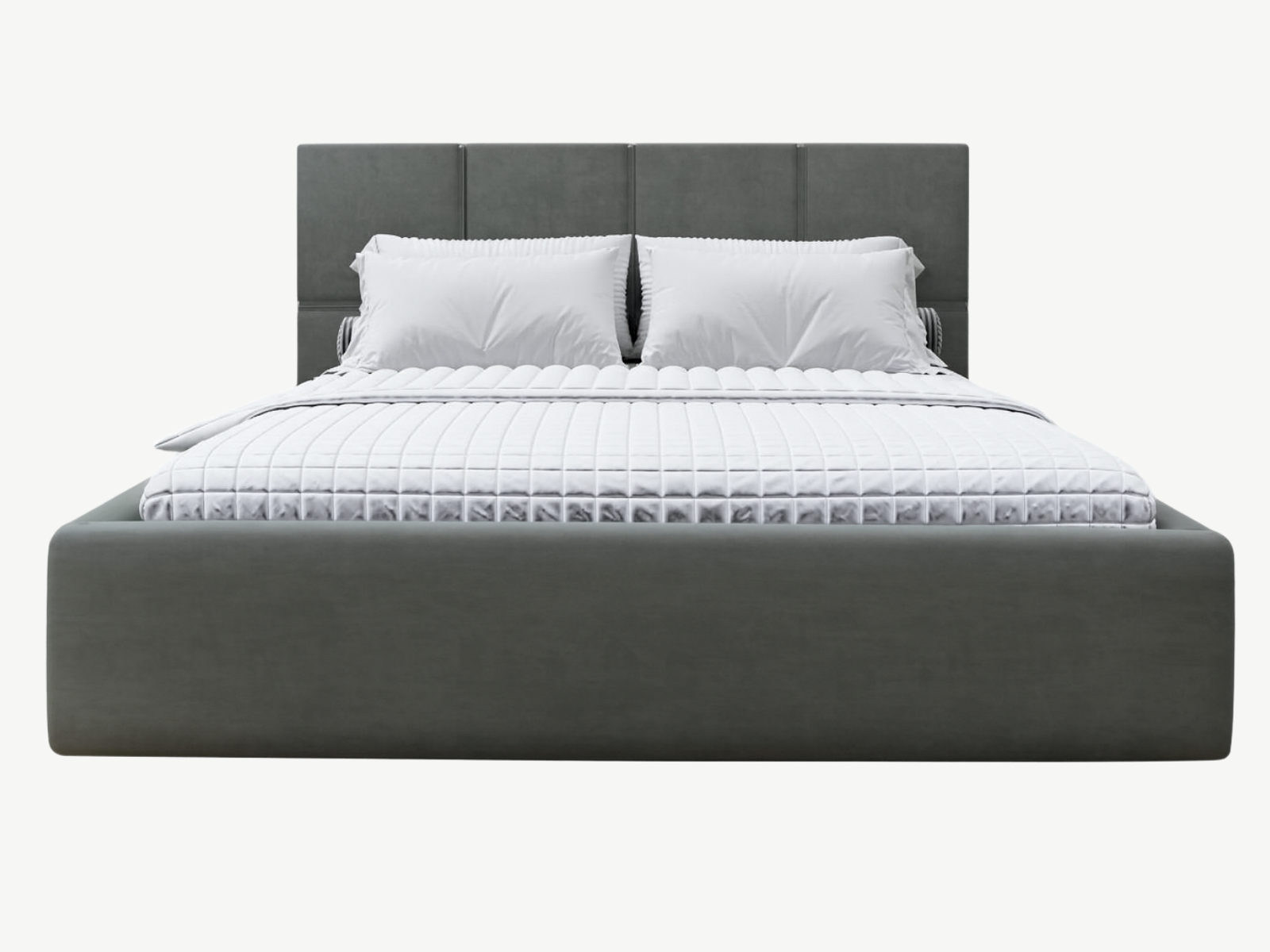 Łóżko Tapicerowane Eva wyróżnia się panelowym wezgłowiem w układzie kwadratów. W standardzie stelaż metalowo-drewniany oraz podnoszony pojemnik na pościel. Minimalistyczna bryła, elegancki detal i praktyczne przechowywanie – idealne do nowoczesnej sypialni.