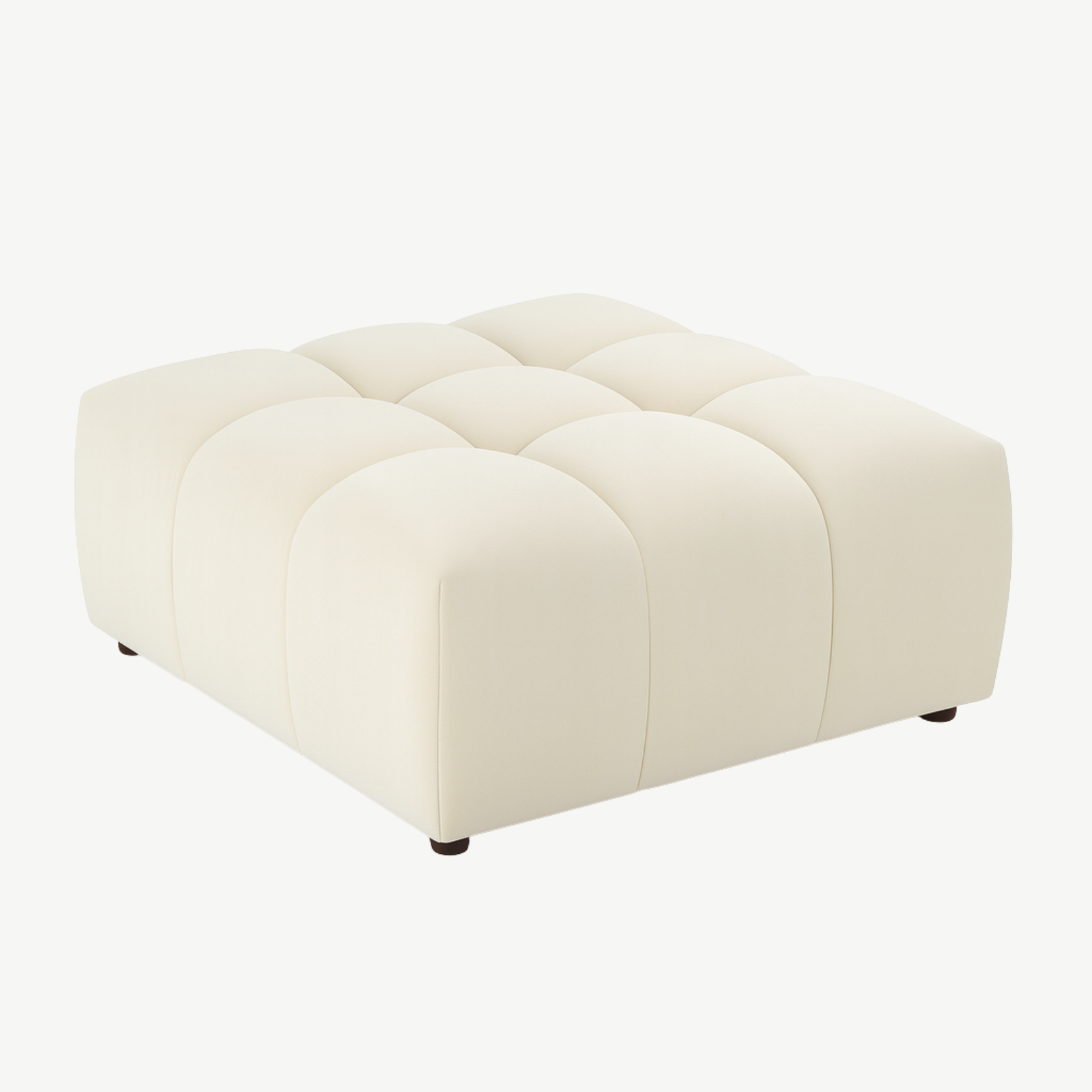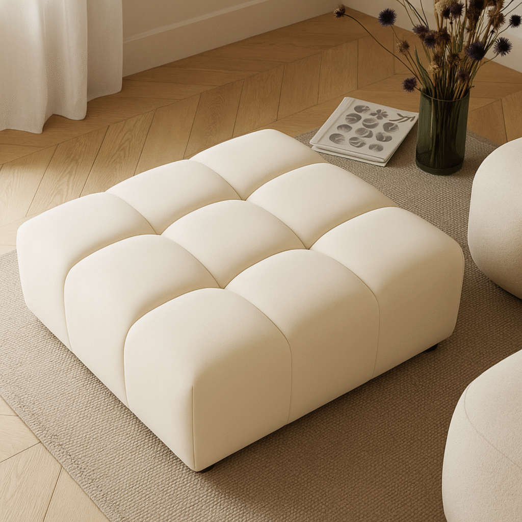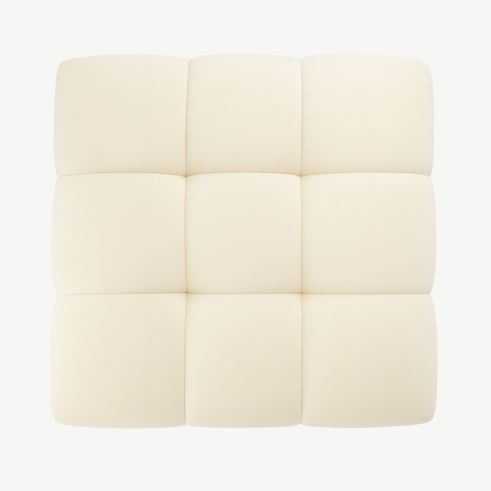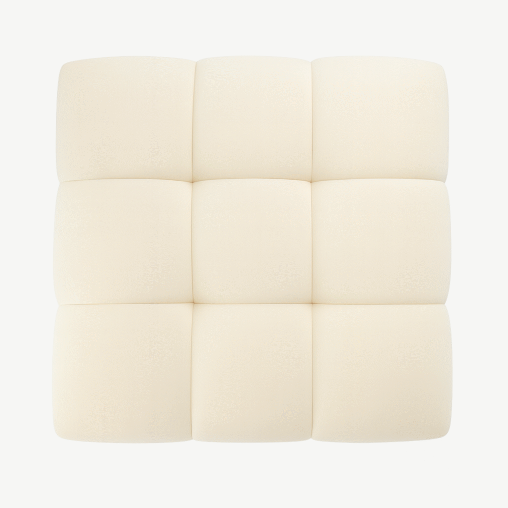 Duży format i niska, pełna podstawa zapewniają stabilność. Pufa nie ucieka przy użytkowaniu, a miękko zaoblone narożniki zwiększają bezpieczeństwo w codziennym ruchu domowym.