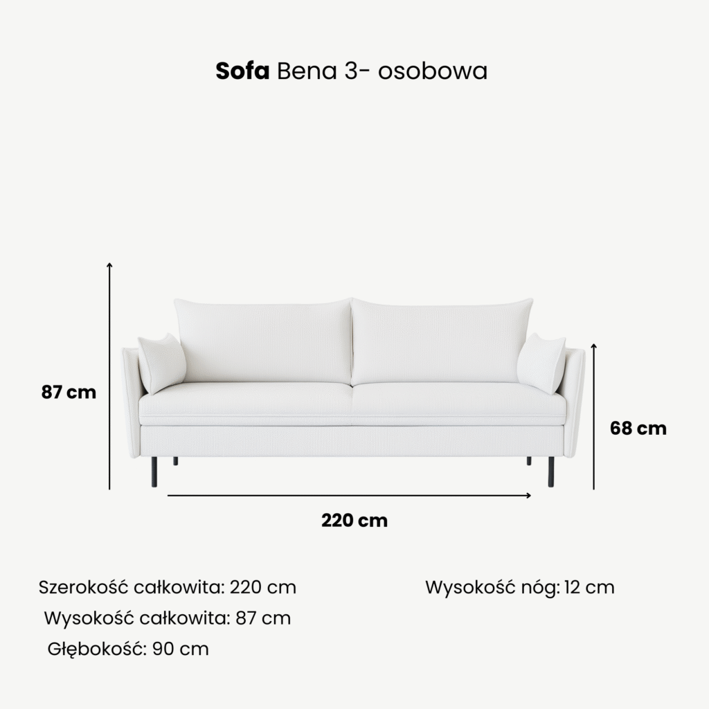 Sofa Bena to doskonały wybór dla osób poszukujących mebla, który łączy estetykę, funkcjonalność i wygodę. Sprawdza się zarówno jako eleganckie miejsce do codziennego odpoczynku, jak i praktyczne rozwiązanie w niewielkich przestrzeniach.