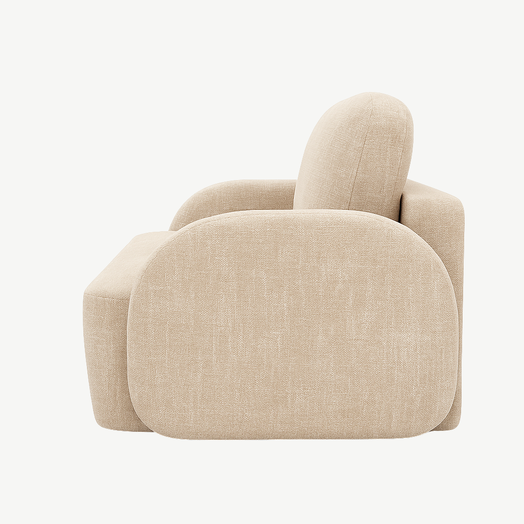 Jej zaokrąglone oparcia i miękkie podłokietniki tworzą przyjemną, otulającą formę. Delikatna linia i naturalne odcienie tkanin wprowadzają do wnętrza harmonię i ciepło.